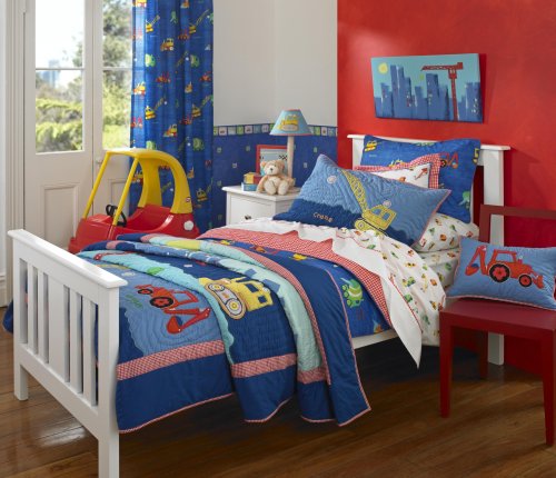 Freckles Construction twin duvet is printed with colorful construction machinery with a blue back ground which reverses to red gingham.