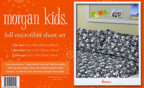 Skull Bones 4 Piece Full Microfiber Sheet Set Morgan Kids Boys Crossbones Sheets. One full flat sheet 81" x 96" (206cm x 244cm). One full fitted sheet 54" x 75" (137cm x 191cm). Two pillowcases 21" x 30" (53cm x 76cm). Machine wash cold, tumble dry low.