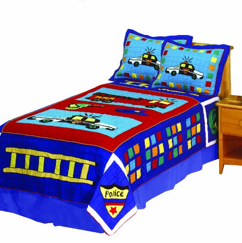 This quilt set features police cars and fire trucks in vivid color of blue, orange , red, green and yellow. A lovely quilt for any kids' room.