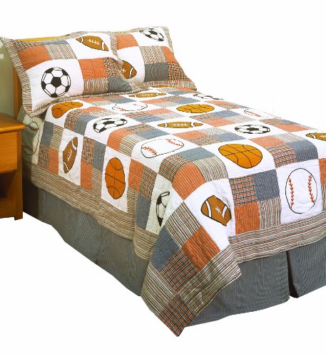 This quilt set features soccer, football and baseball aqppliques in orange, white, and black, embellished by plaid patchworks. The look is clean and sporty. A Perfect look for any sports lovers.