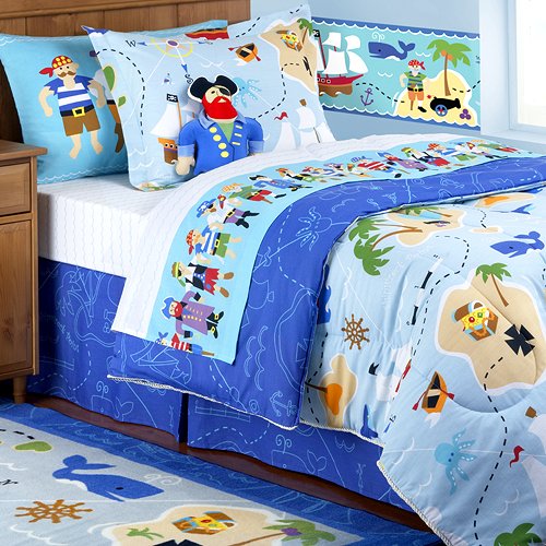 Ahoy Mateys! Our Embellished Pirates comforter is ultra soft and has a lighter weight fill, which is very comfortable for your little ones! The top features pirate ships, secret hideaways, sandy beaches and treasure chests on an ocean blue background. The reverse is a coordinating blue and teal map of the high seas. A fanciful nautical rope cording trims the outer edge for extra fun!Our Embellished Pirate sheets make a real splash! They are decorated with rows of light blue waves on a white background. The flat sheet is hemmed with a coordinating ocean blue and a row of colorful pirates. The pillowcase features a crew of four pirates on a light teal background.